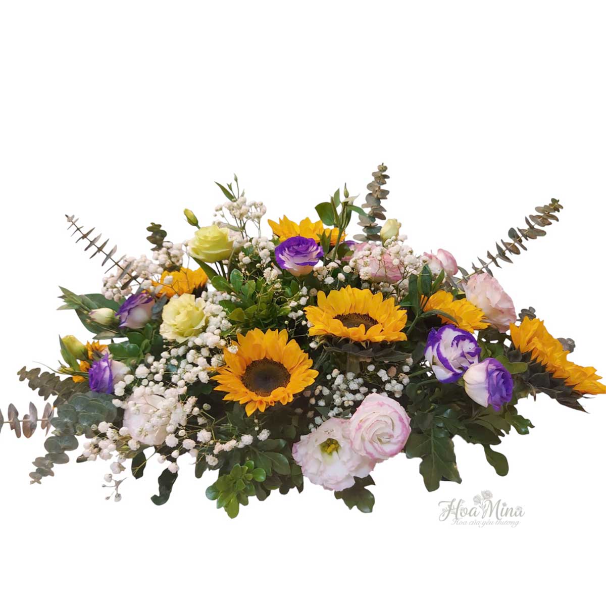 Hoa bàn hướng dương mix hoa tươi với sắc vàng rực rỡ, kết hợp cùng lan tường nhiều màu và hoa baby trắng, mang đến vẻ đẹp sang trọng và ấm áp cho không gian. Thích hợp trang trí bàn đại biểu, bàn họp, hội nghị, sự kiện lớn nhỏ. Đặt ngay hoa bàn tại Hoa Mina để không gian thêm tinh tế, chuyên nghiệp và ấn tượng.