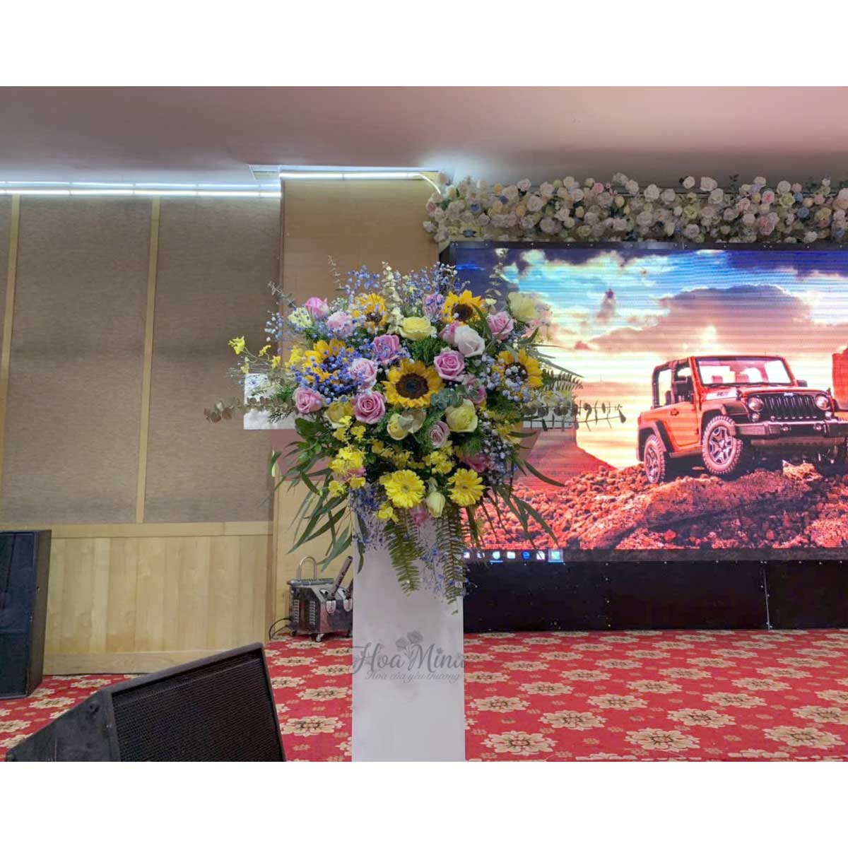 Kệ hoa treo bục phát biểu là lựa chọn hoàn hảo để tôn vinh không gian của những buổi lễ, hội nghị hay sự kiện quan trọng. Ngay từ ánh nhìn đầu tiên, sắc vàng rực rỡ của hướng dương, xen lẫn nét dịu dàng của hồng pastel và sự điểm xuyết thanh tao từ hoa xanh tím, tất cả đã tạo nên một tổng thể hài hòa, sang trọng và đầy khí chất.